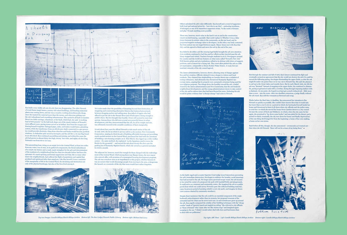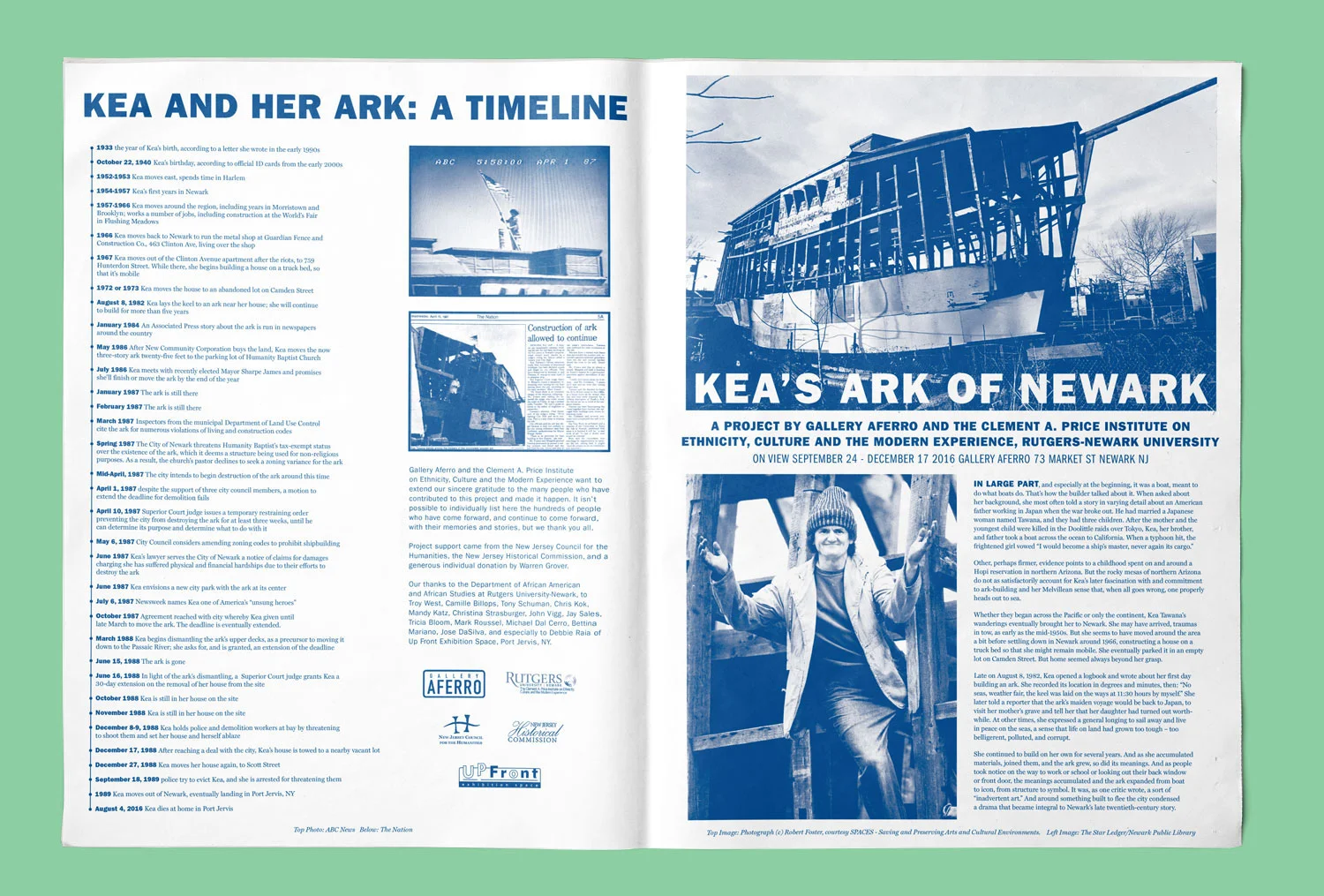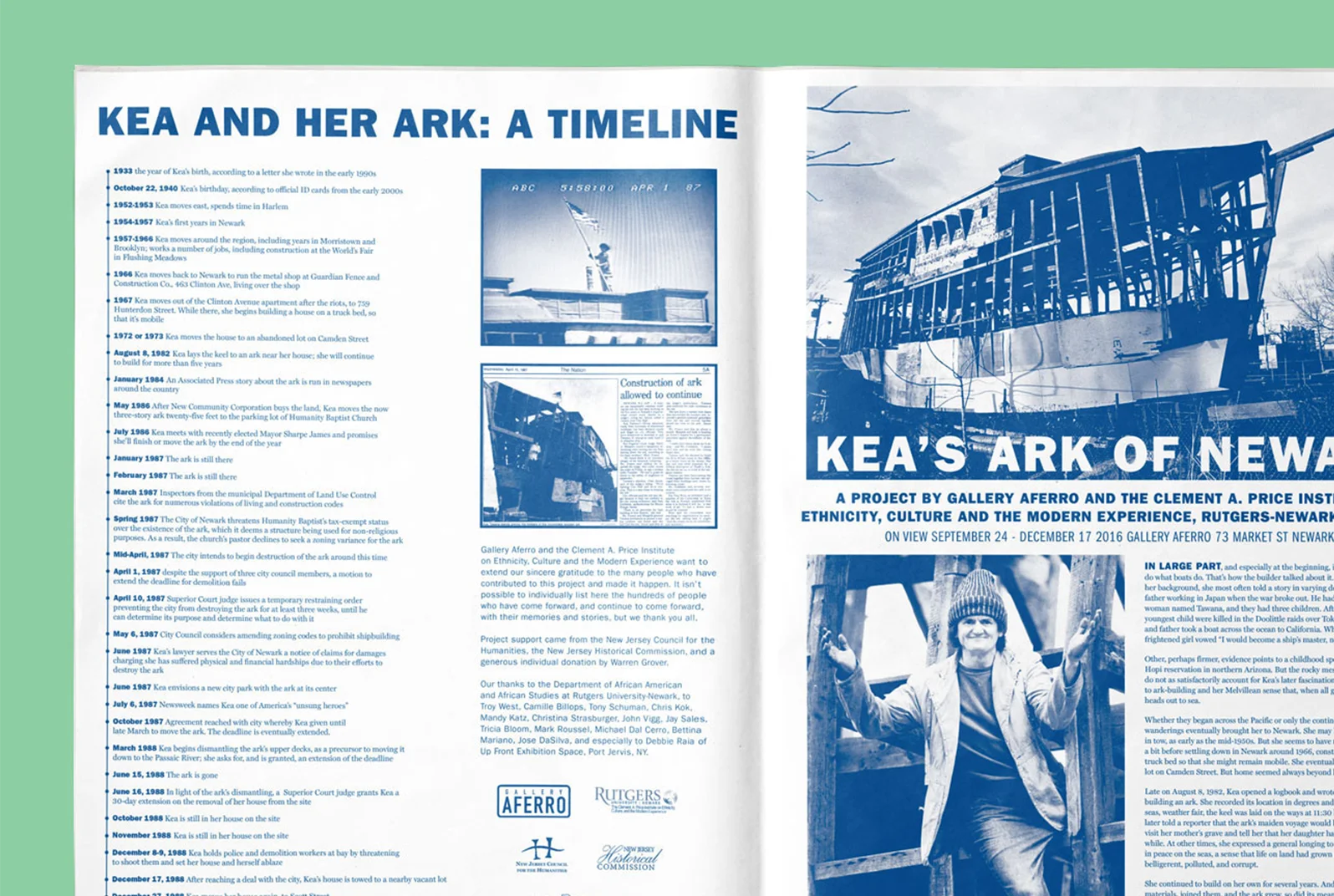 Gathering content and historical articles to understand the story I began the editorial layout telling the story of Kea’s battle to keep the Ark. Working with Gallery Aferro and the printer we iterated on our ideas and sourced the proper newsprint. Our goal was to transport the visitors to this particular time and place in Newark’s history.