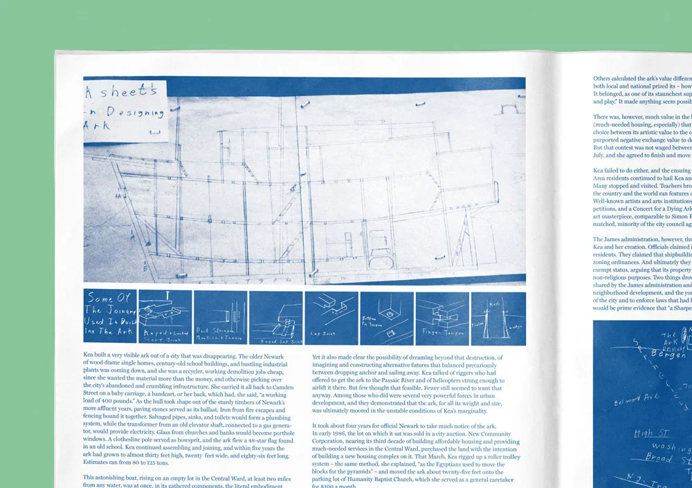 Kea’s Ark was a three-story wooden boat that rose above Newark, NJ. The goal was to complete and then float the ark onto the Passaic River but after a years long battle with the City of Newark and local developers the Ark was eventually dismantled. I was tasked by Gallery Aferro to produce a newspaper article to share her story.