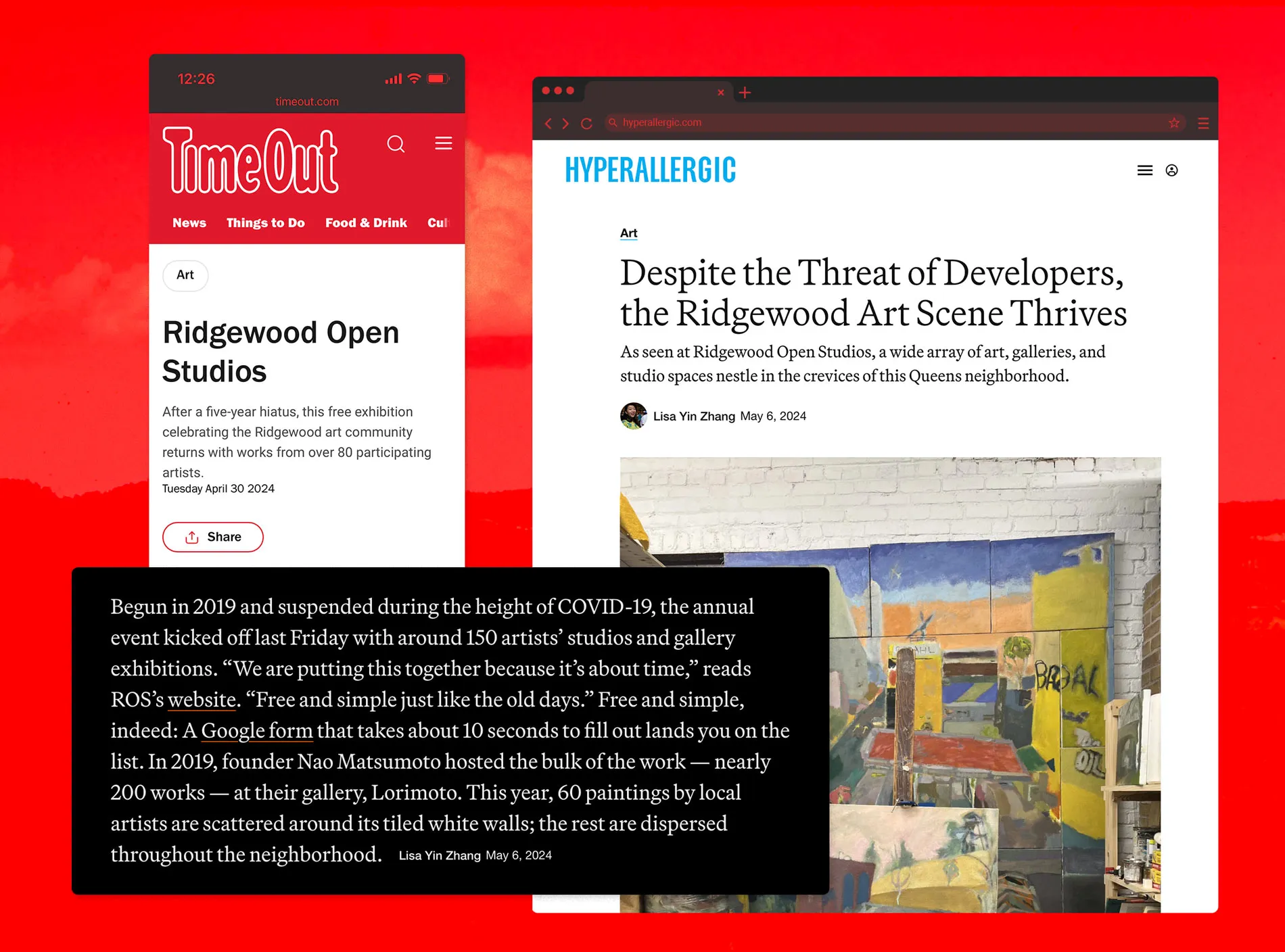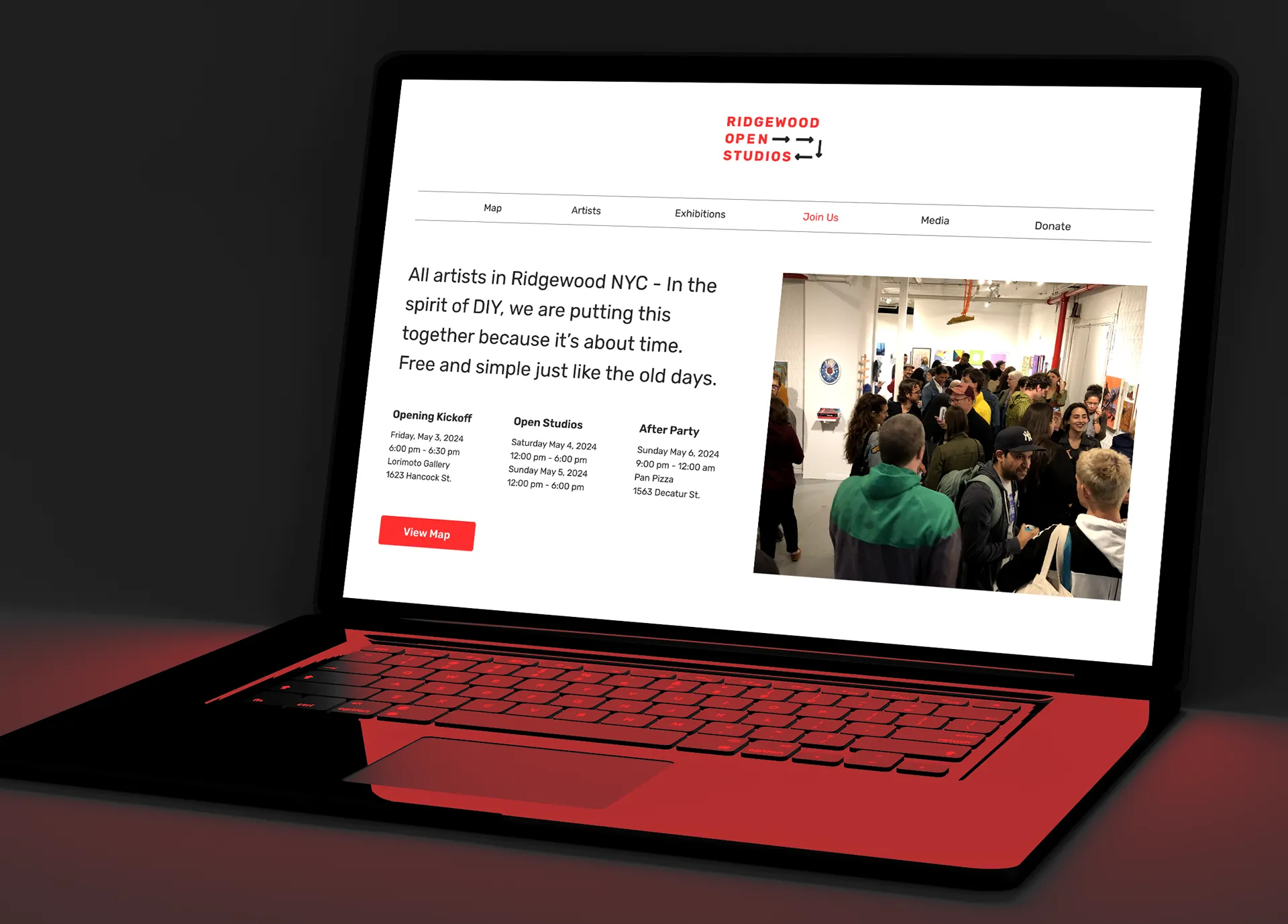 After feedback and iterations, we finalized the branding. I collaborated with Lorimoto Gallery to create a landing page for sign-ups and event information, built Ridgewood Open Studios' Instagram presence through a social media campaign, and organized kick-off/networking events for artists to connect and collect promotional materials. We also secured press coverage to amplify the event's reach.